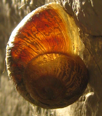 This snail has been hanging out on my back patio wall. Not sure for how long, but there are cobwebs involved, so it's been awhile. Anyway, this morning, the light hit it just right. It was glowing.