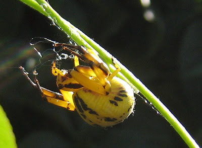 I marked the spot on the trail with an arrow of twigs. I do this occasionally so I can try to re-find the bug in question at a later date. Crab spiders usually stay within in a small territory, as long as food is available. I will check on Saturday morning before the Bug Safari and see if she's still there.
