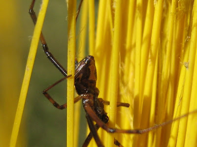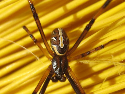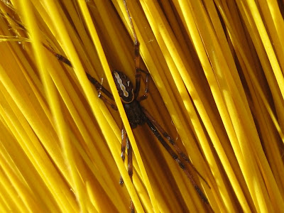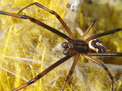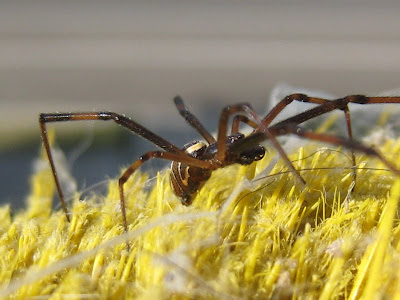 This is truly the peak, or maybe just past the peak of spider season. They are absolutely everywhere. Sadly, I haven't seen nearly enough of the big orb-weavers, but there have been lots of widows, black and brown. This is a black widow male who had made a nice home for himself right over our front door. At Michael's urging, I got rid of him, but not before taking his picture several times. The yellow stuff is my broom.