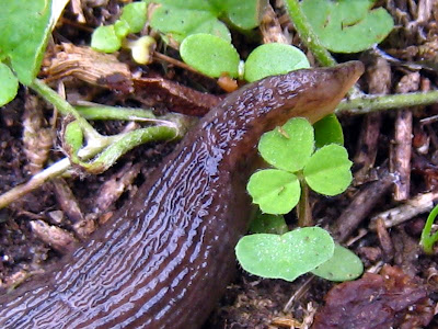 I came across this slug the other morning in my back yard. At about 2 1/2 inches, it's about as big as slugs get around here.