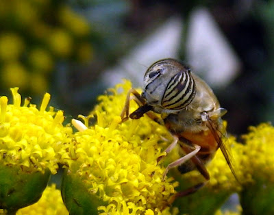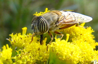 This bee-sized hoverfly has a strikingly striped set of eyes. But I was amused by its busy tongue, dab-dab-dabbing all over the flowers.