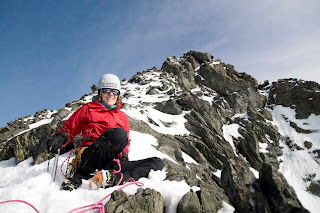 | Ruth on the summit ridge with the summit behind her. She is sitting down because of high winds. |